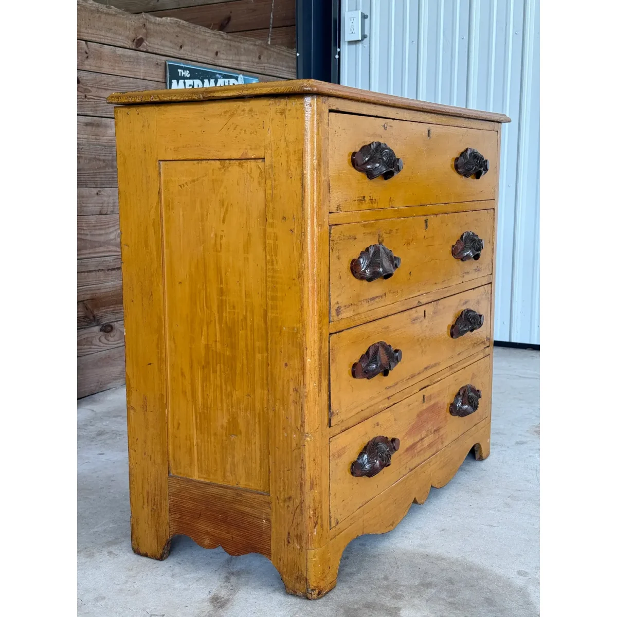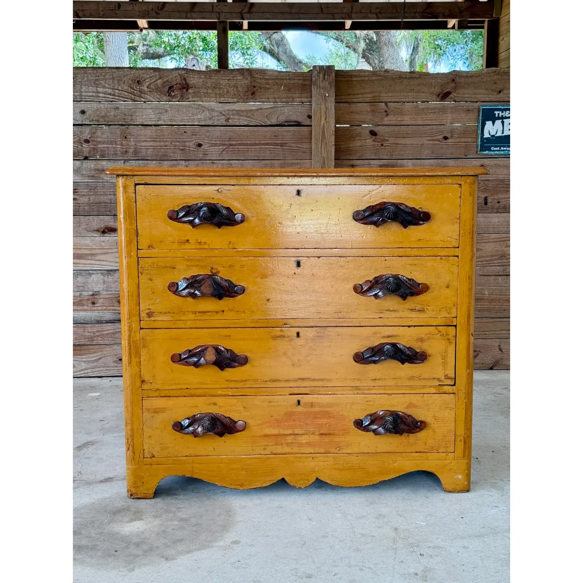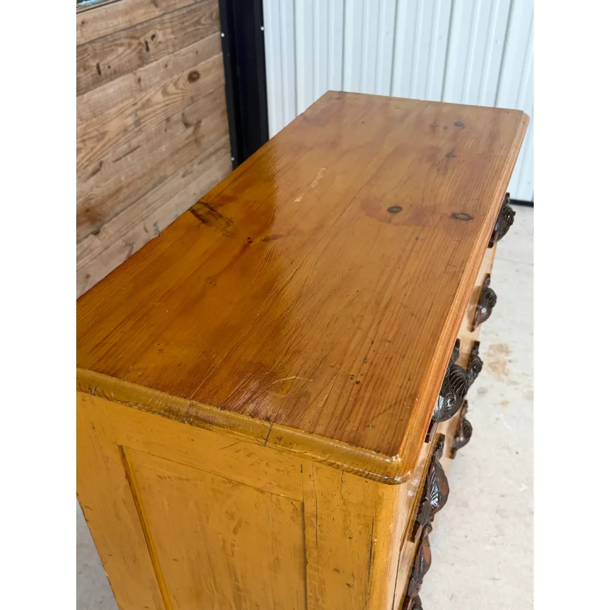 This 19th-century piece features four spacious drawers with hand-cut dovetails and ornate hand-carved wooden pulls, two of which are missing their front decorative flourishes—adding to its rustic authenticity and storied past.