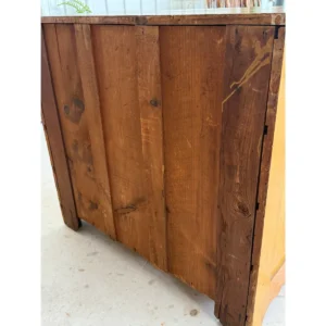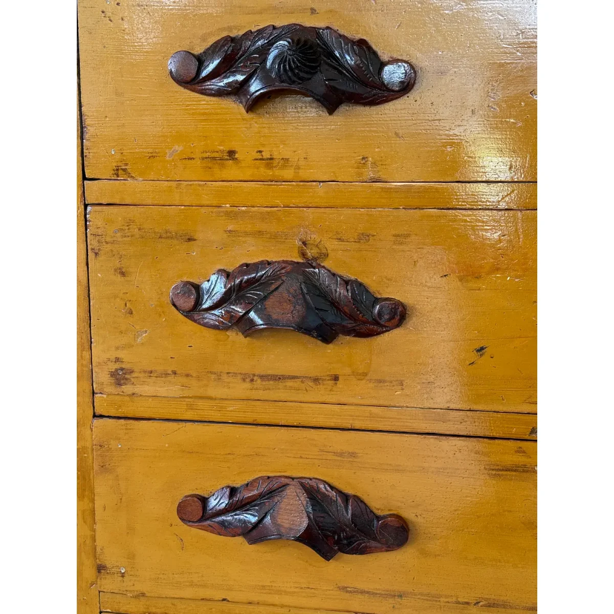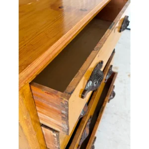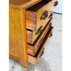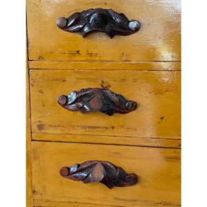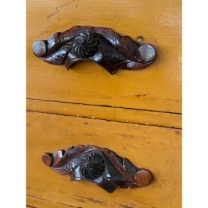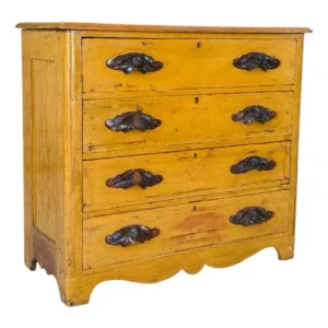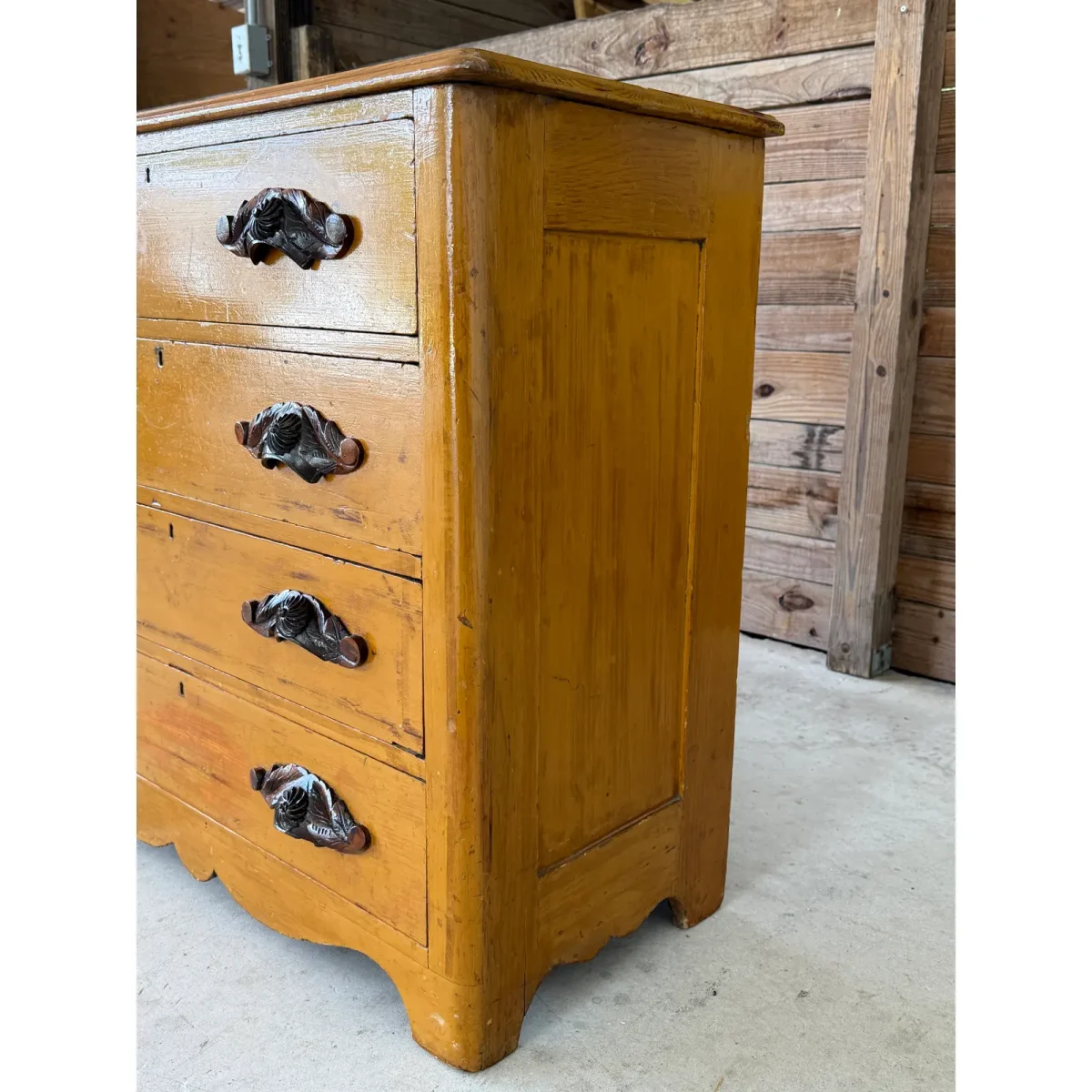 This 19th-century piece features four spacious drawers with hand-cut dovetails and ornate hand-carved wooden pulls, two of which are missing their front decorative flourishes—adding to its rustic authenticity and storied past.