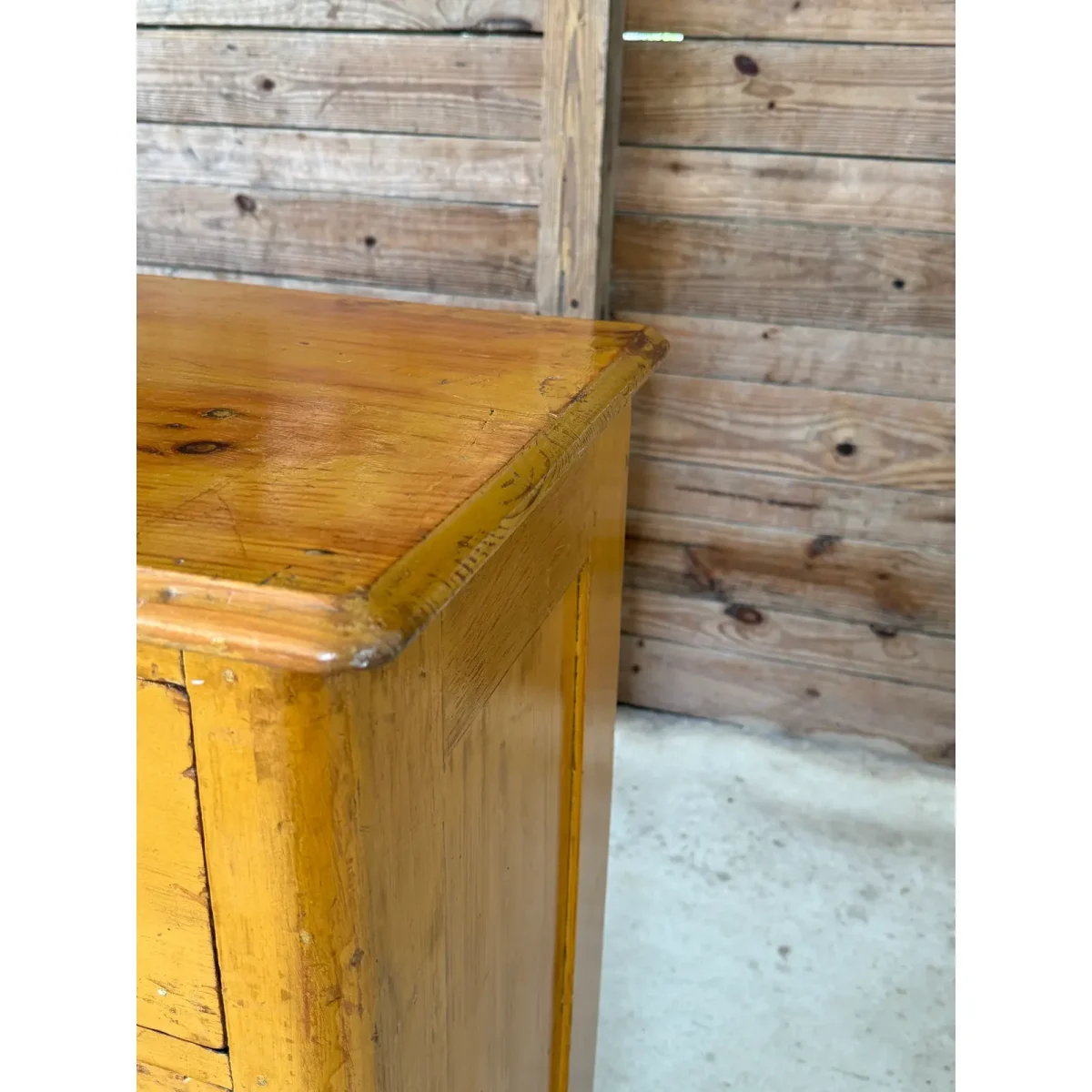 A charming antique American pine chest of drawers, showcasing its original mustard-yellow finish and beautifully aged character.