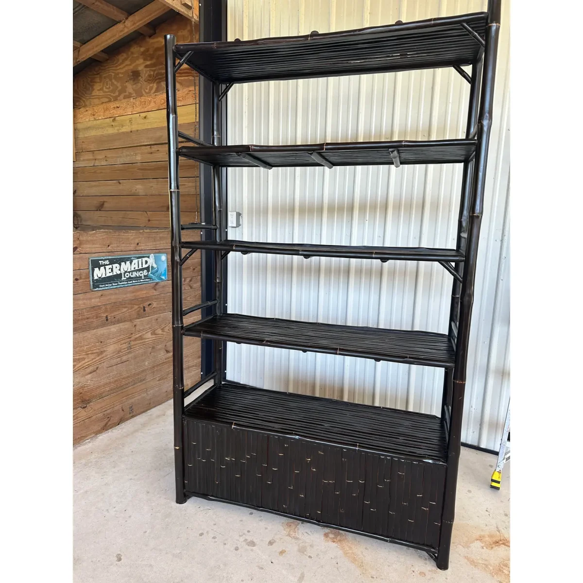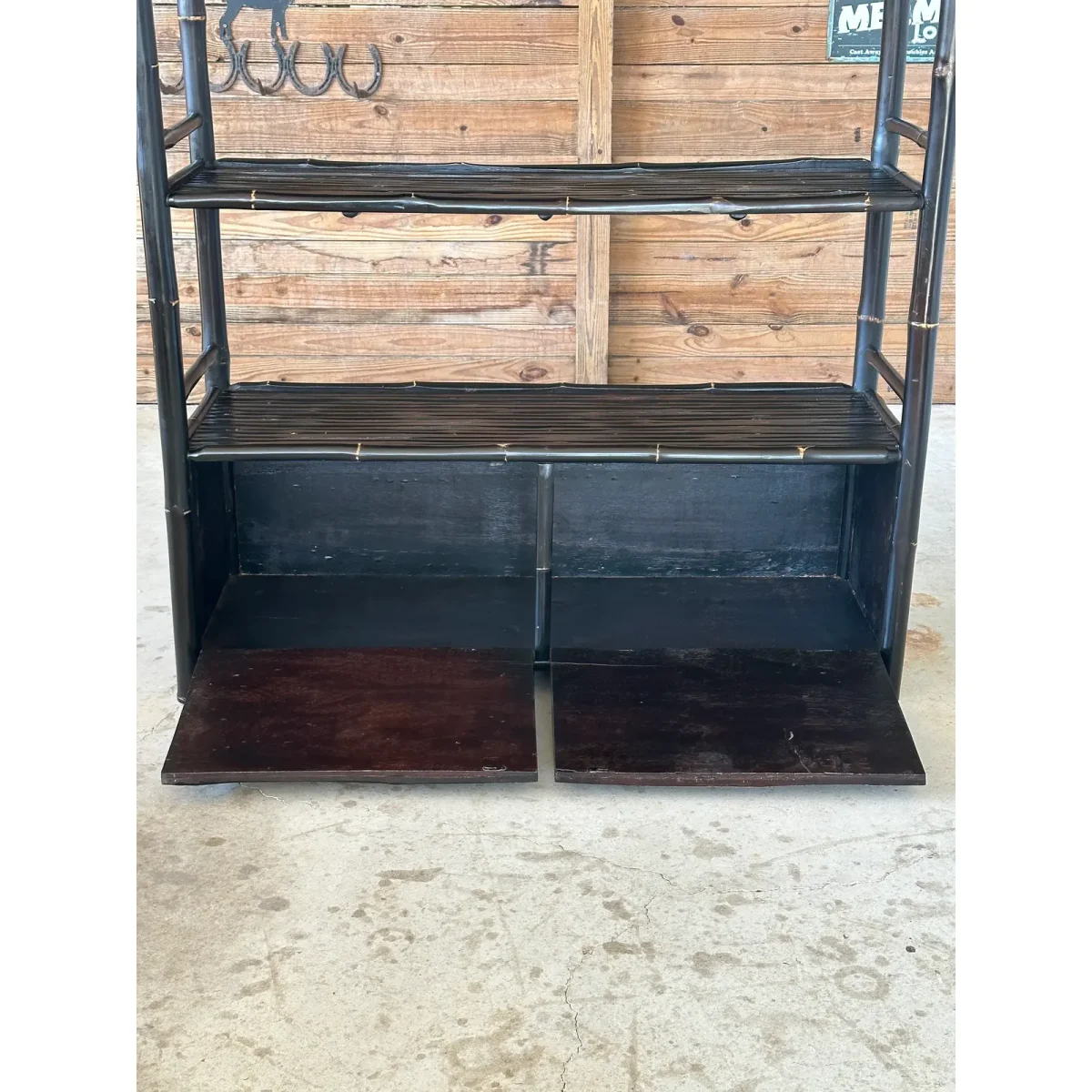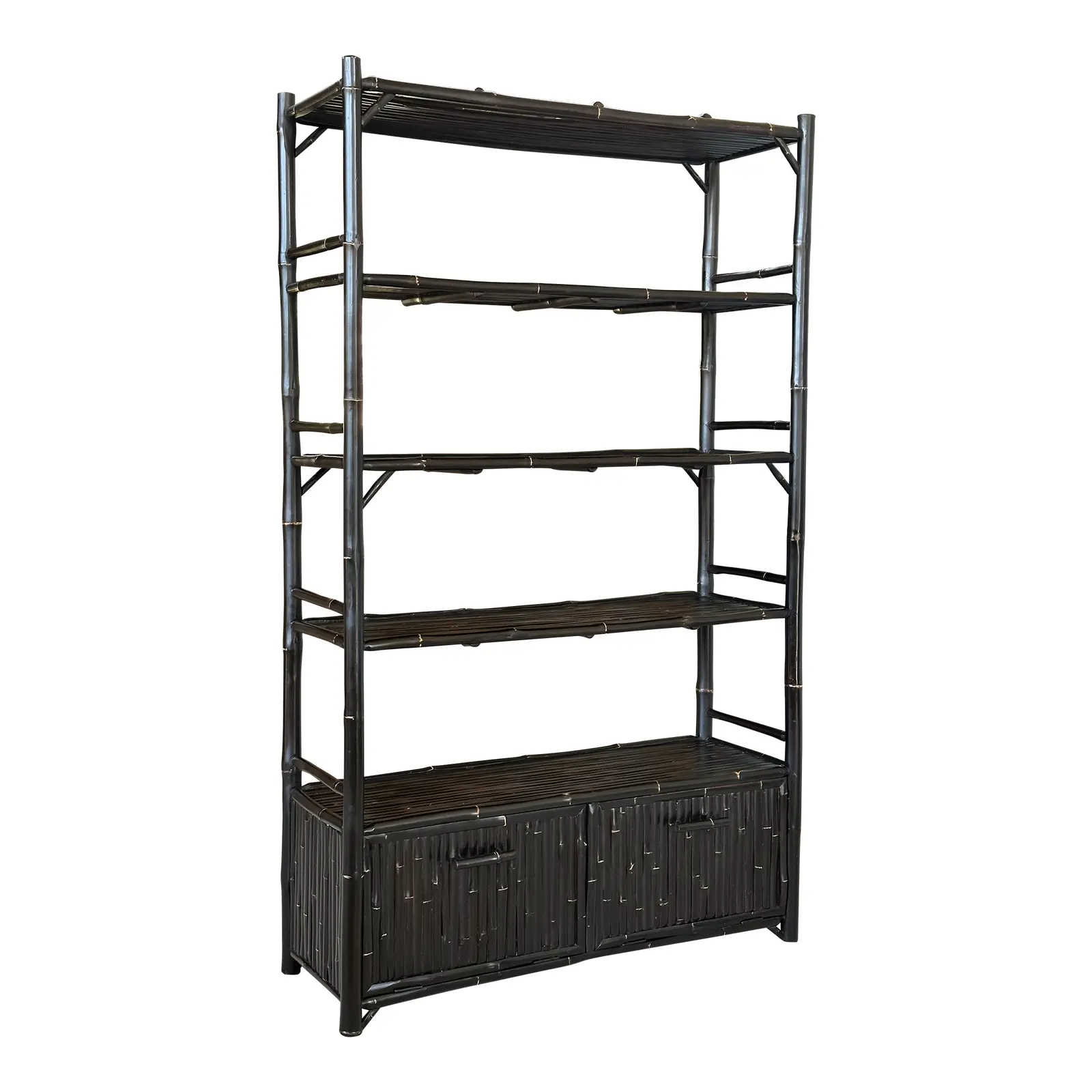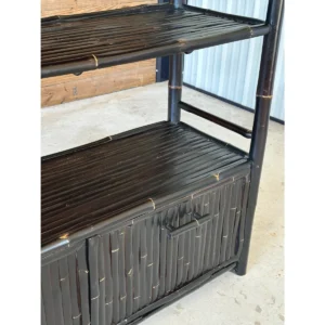 Fantastic black bamboo Etagere with two drop down doors and five shelves in a British Colonial coastal Regency style. Great piece for an office or living room for books and accessories fabulous heavy piece.