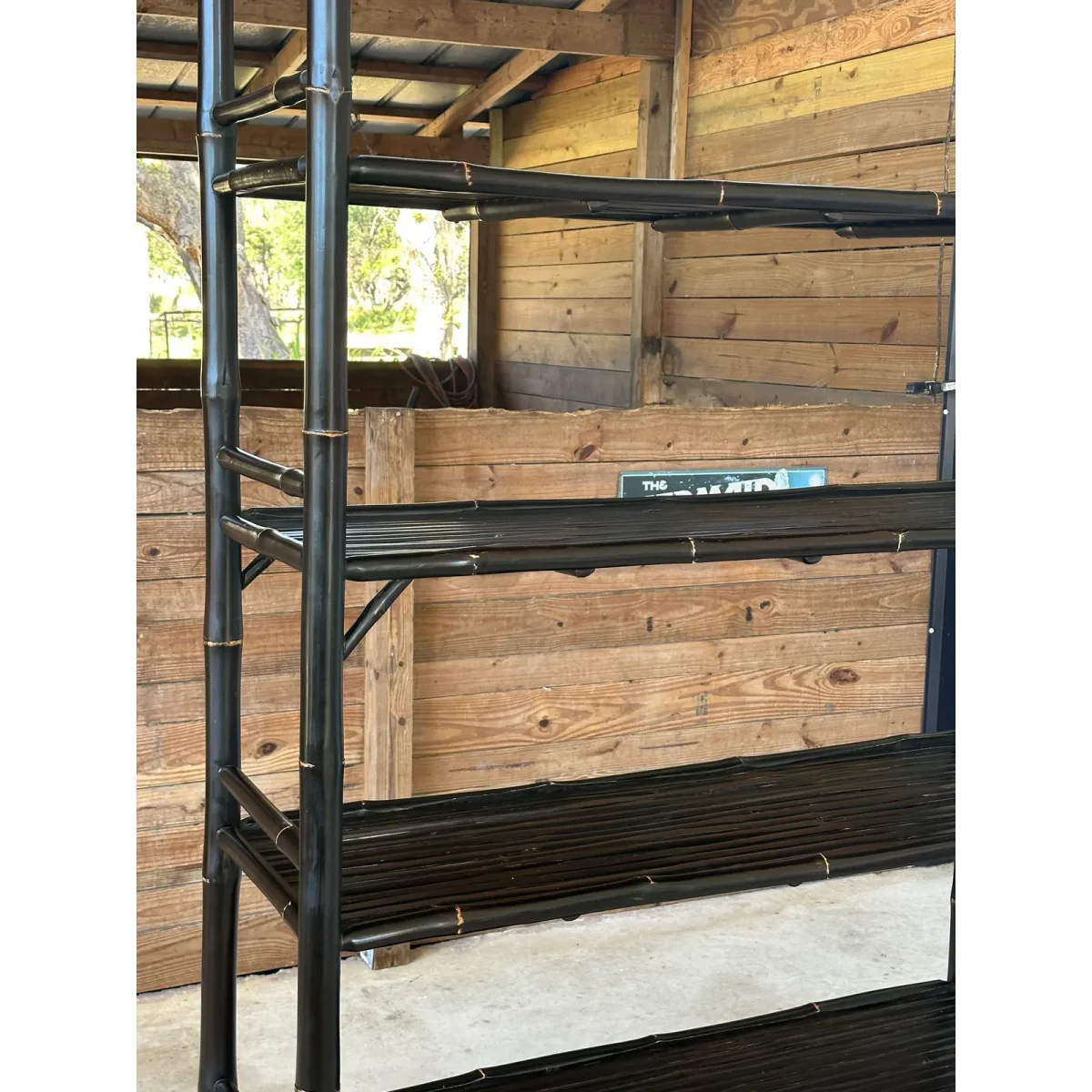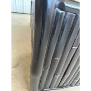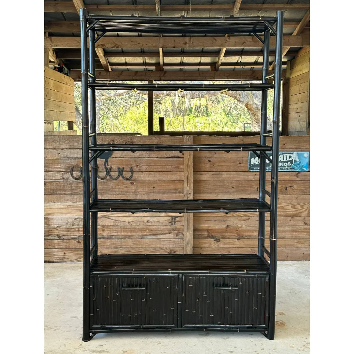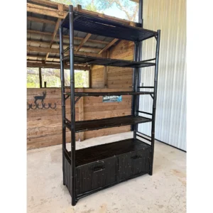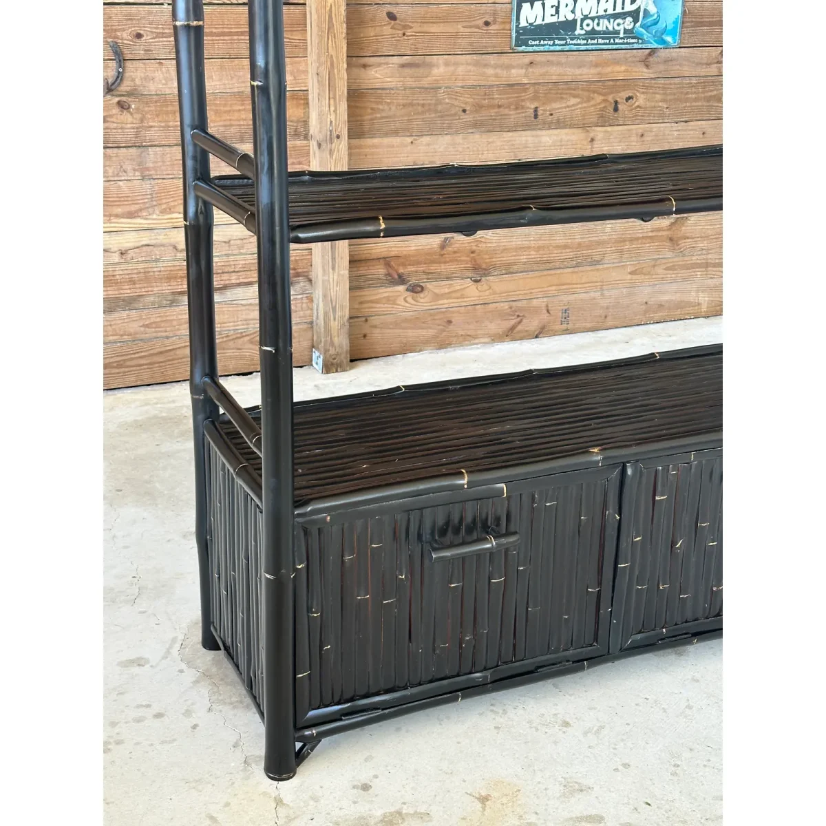 Fantastic black bamboo Etagere with two drop down doors and five shelves in a British Colonial coastal Regency style. Great piece for an office or living room for books and accessories fabulous heavy piece.