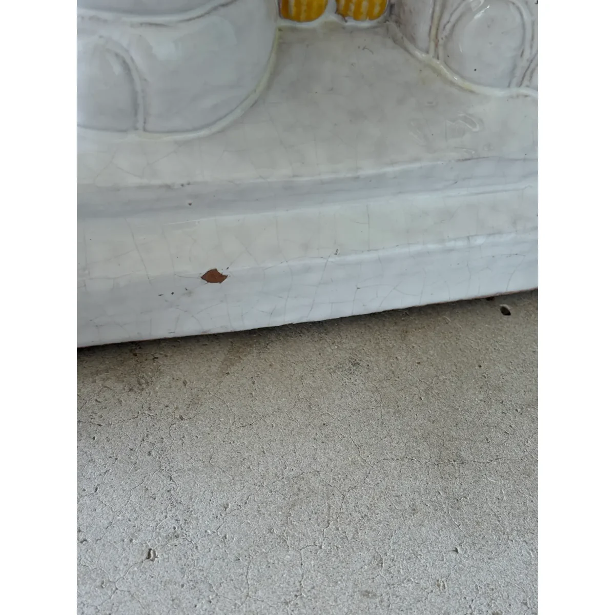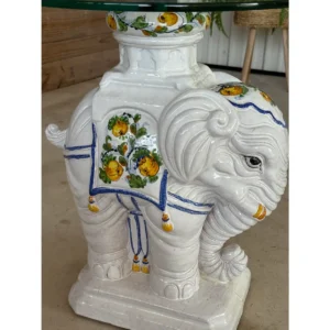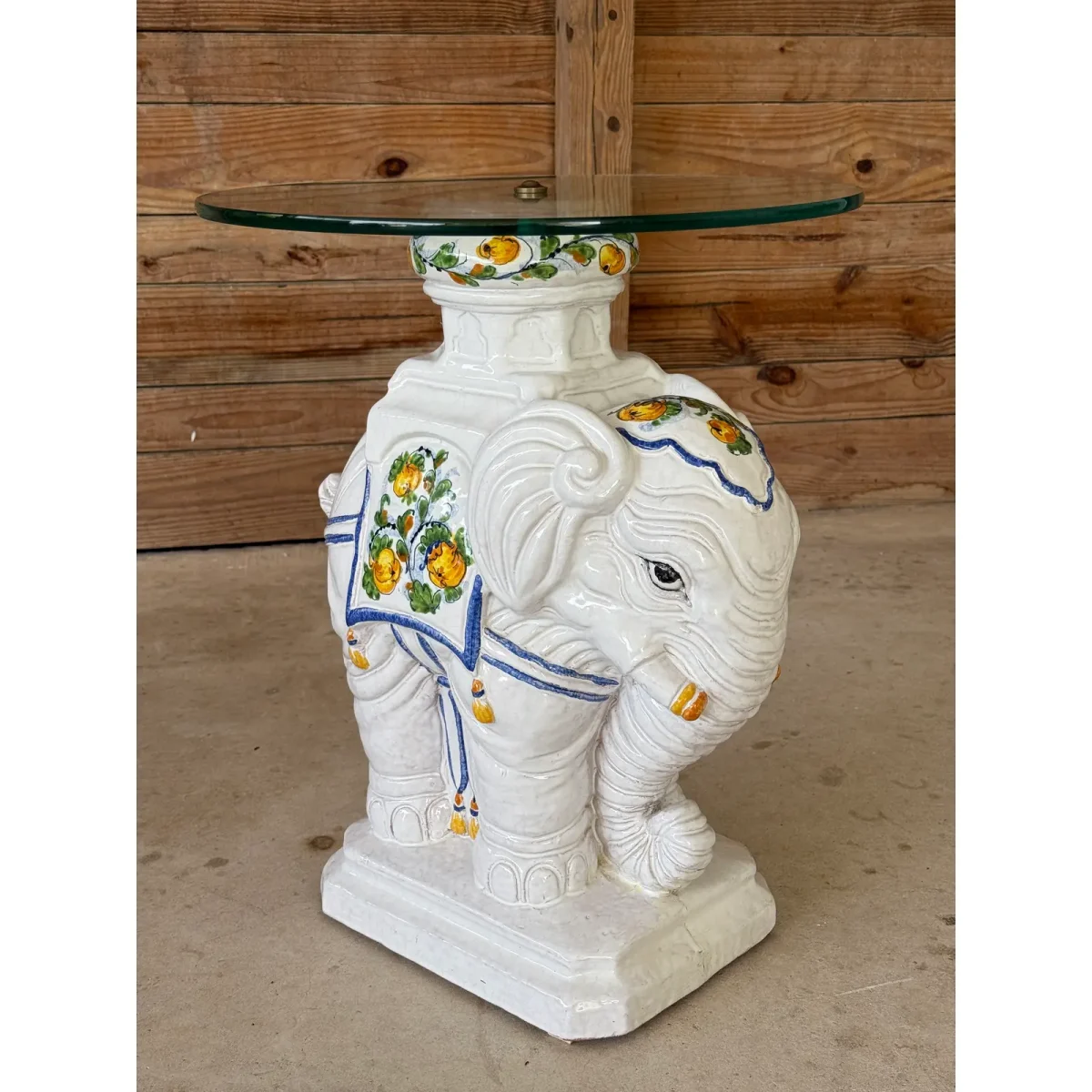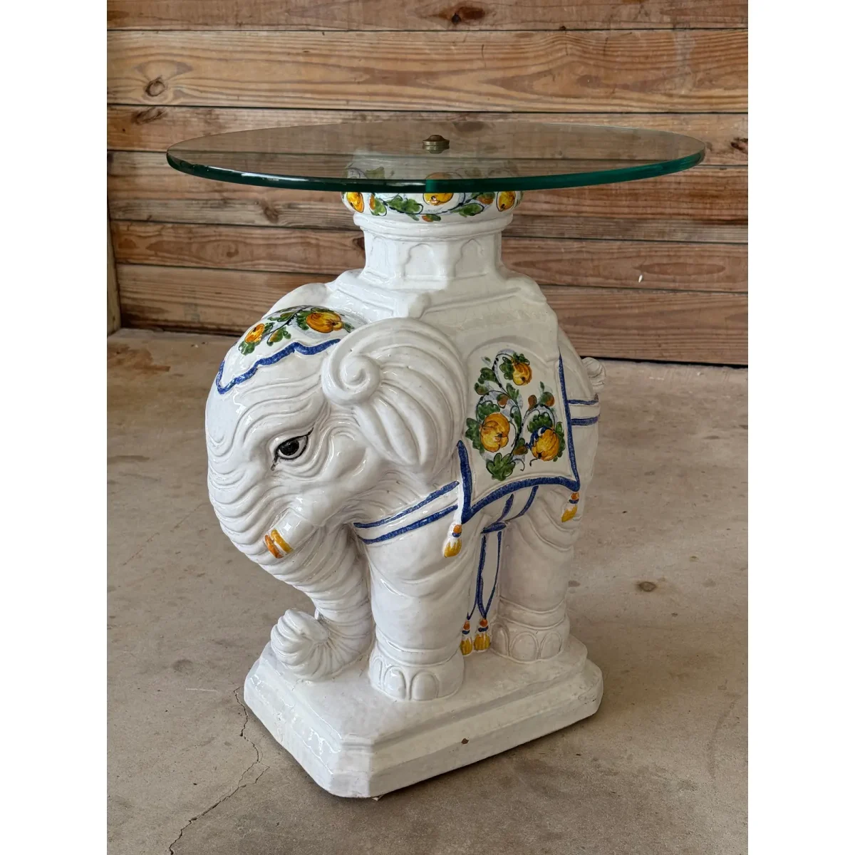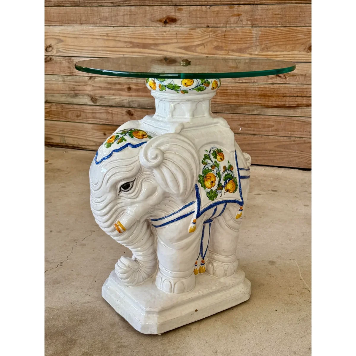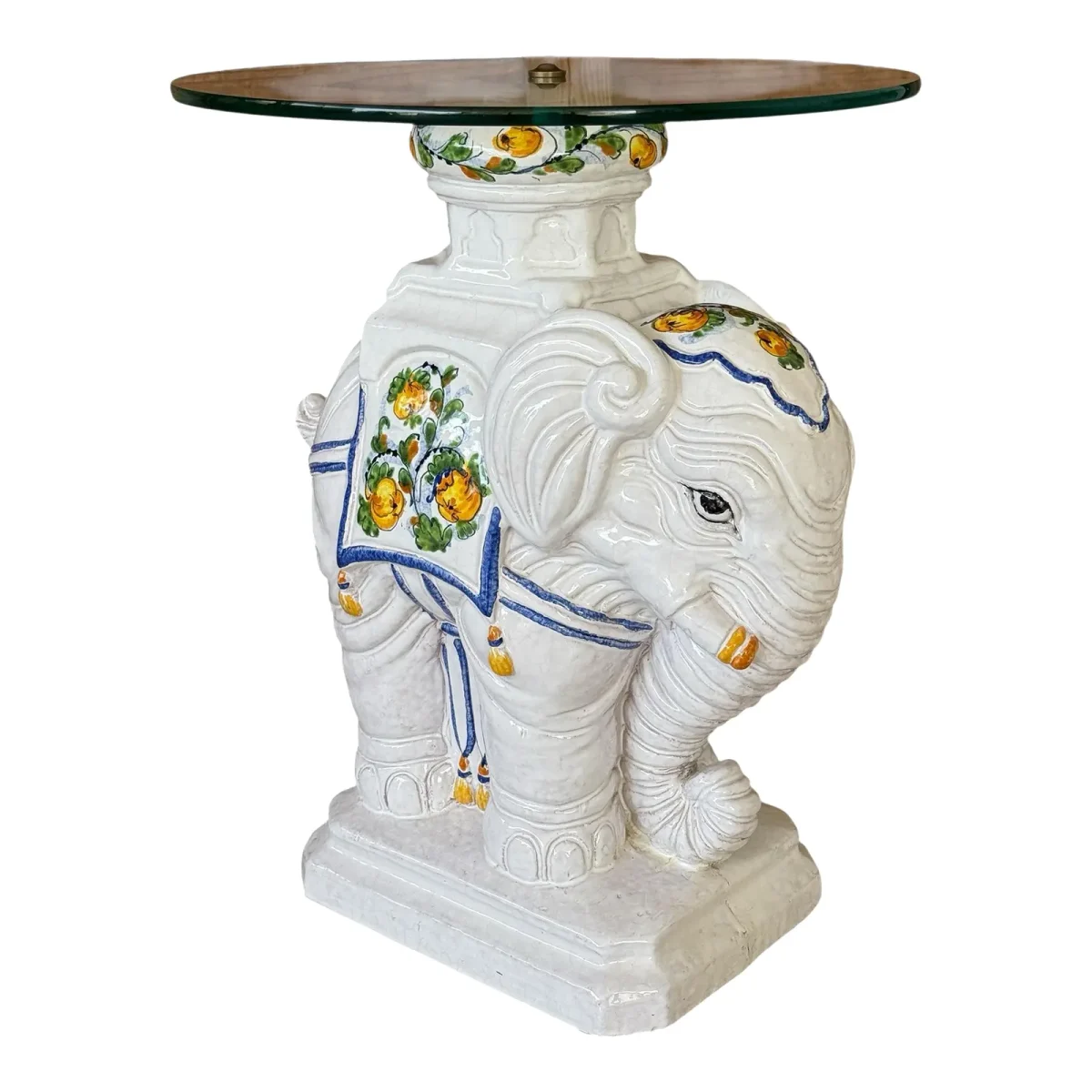 Vintage Italian Glazed Terracotta Elephant Side Table With Hand-Painted Details and Attached Glass Top