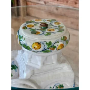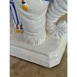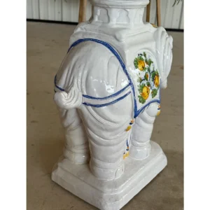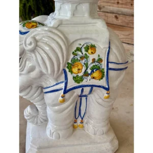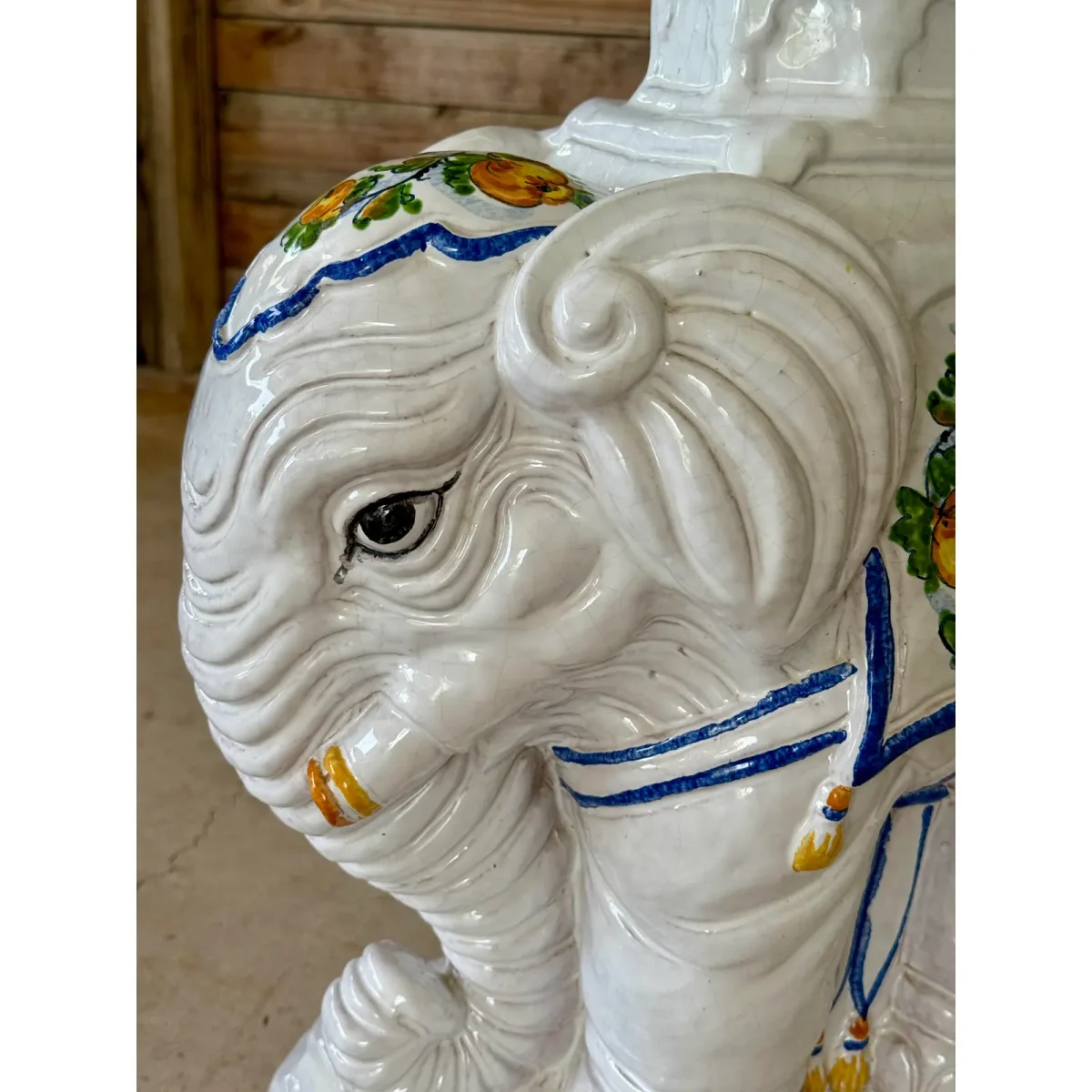 Whimsical yet regal, this vintage Italian terracotta elephant side table features a richly glazed surface with vibrant hand-painted floral and tassel motifs in tones of yellow, green, and blue.
